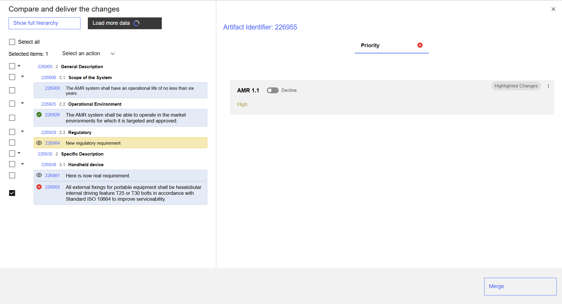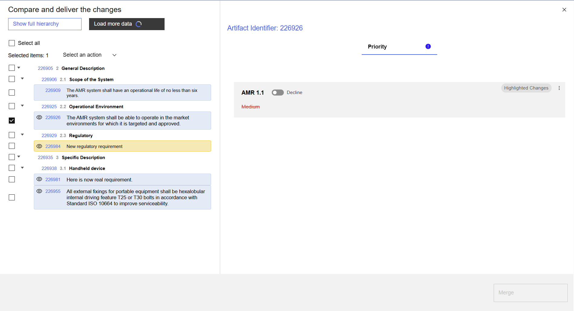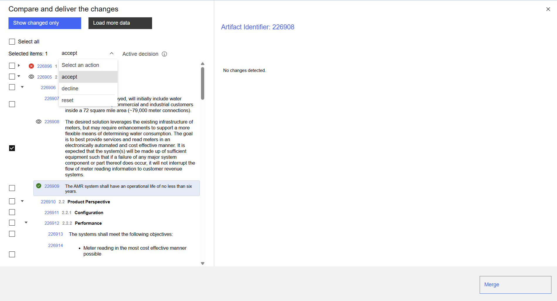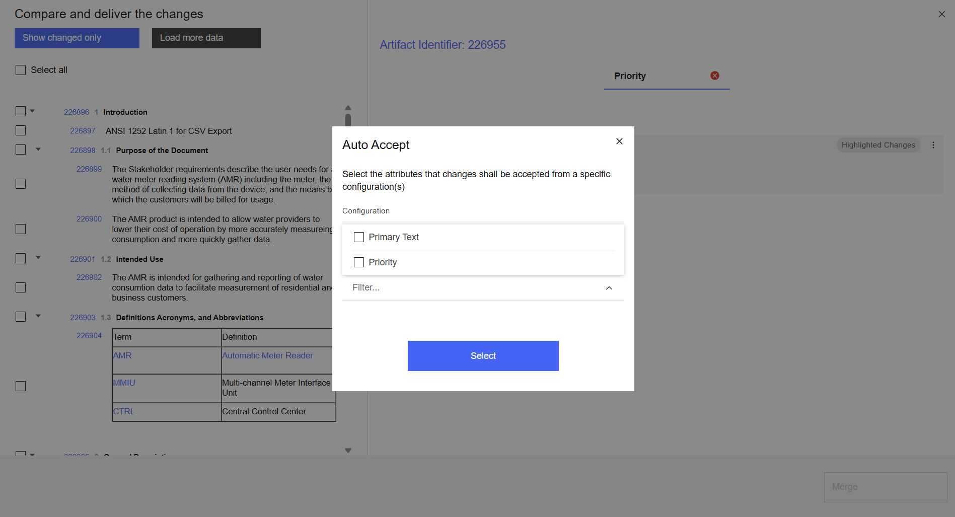 Additionally, to the manual accepting/declining the changes, the users can use the so-called auto-accept feature. This feature allows the users to do the selection of configuration and bulk selection of the attributes from which the changes will be accepted for selected artifacts. This feature becomes available once the user selected at least two artifacts from the tree structure.